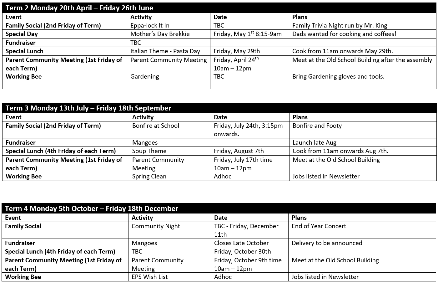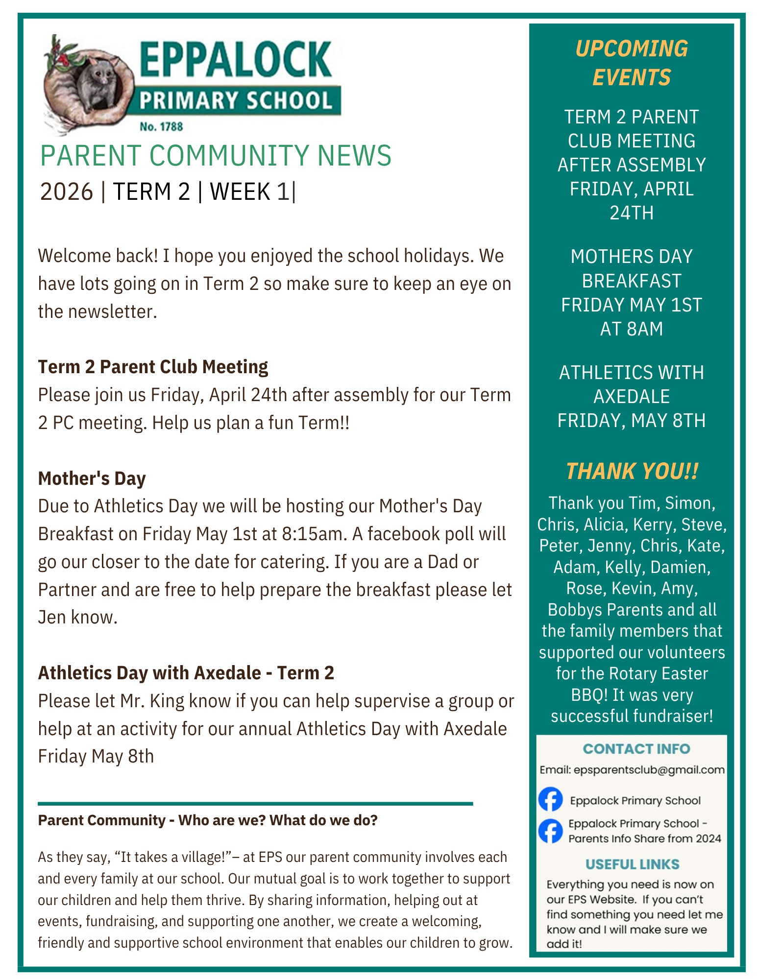 Over the holidays, our community ran our Easter BBQ and this was done in true EPS spirit. Numerous families and extended families were involved on the day and it was a huge success. A big thank you to the following community members and their families: